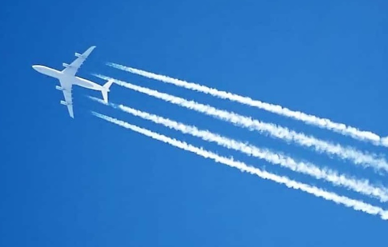 The white trails behind airplanes are not chemicals being released into the atmosphere. They are ice crystals formed from water vapor in jet exhaust, shaped by temperature and humidity at high altitude.